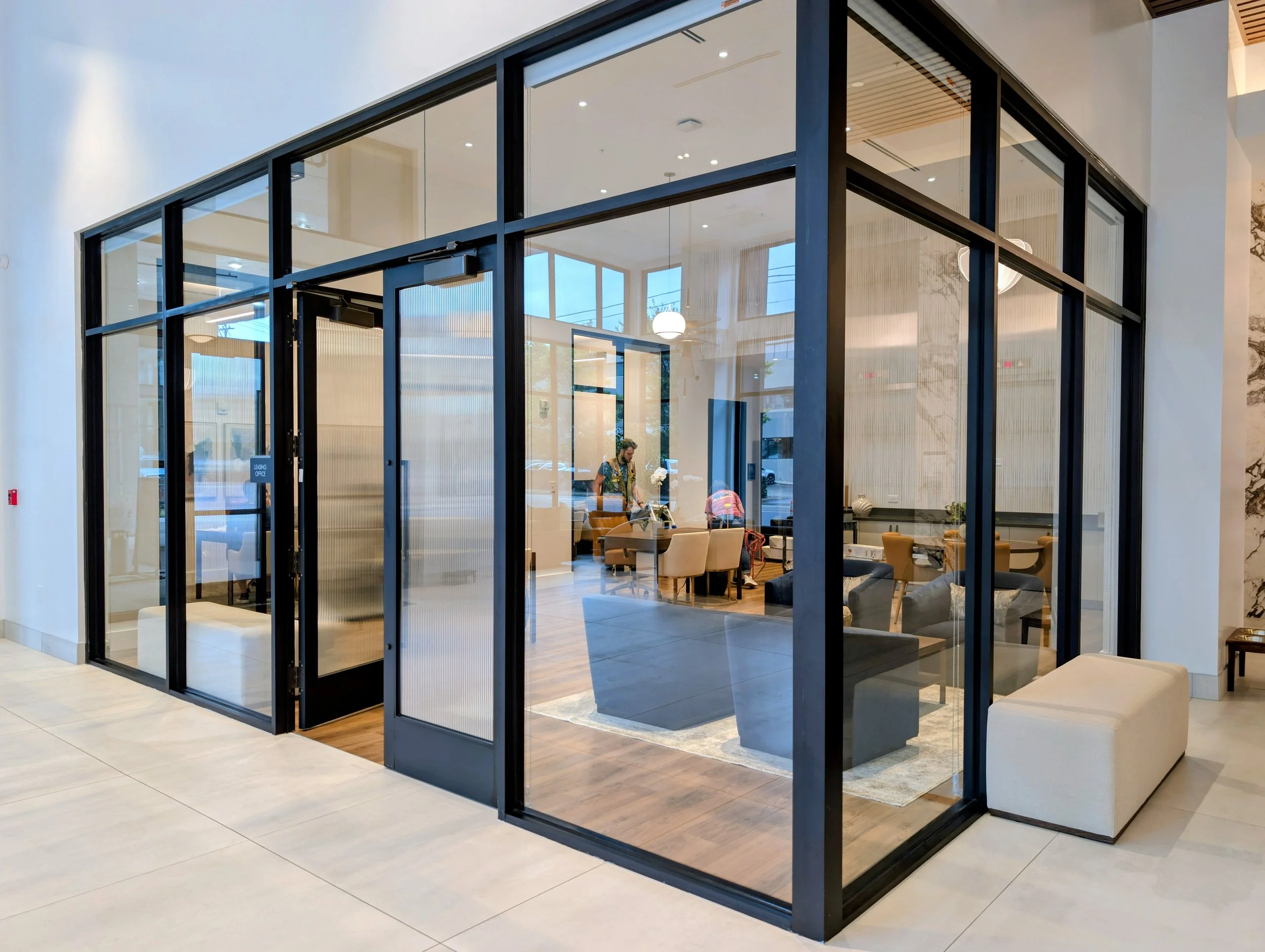 The challenge was to find a film for the elegant greeting area that provided privacy while perfectly complementing the refined architectural design. The client specifically requested a sophisticated look that did not rely on the standard white color often seen with frosted privacy solutions.